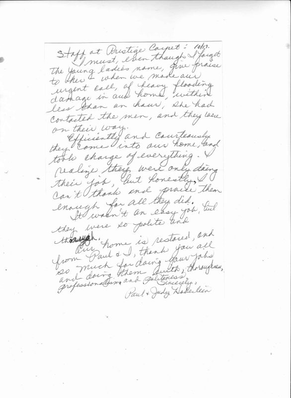 I just wanted to say Thank You for doing such a great job on my carpet cleaning and water restoration. Special thanks to Rick for working with us on the dehumidifiers, turbo fans, applying the mildewcide and finally the carpet cleaning. Jim did a great job cleaning. I called around 10:30 pm & the answering service had Rick call me back that evening. He was very helpful. Becky called the next morning & had the crew to our home the next day. Our downstairs family room flooded. We didn't know until 7:30 pm. We had several inches of rain and the drains backed up. This was the second time in 3 months! The first time was in December. We walked downstairs to 3' of water in some areas. I had all the Christmas decorations out. We had a mess & they were great both times. Lee, Jim, Ed, Josh and all the other guys who helped move furniture & Christmas decorations. I would highly recommend to use Prestige for all your cleaning needs. Great company to work with. When you have something dreadful happen to your home Prestige will come in and make it all clean and help you feel that it is getting thoroughly sanitized. Becky is always so pleasant on the phone. It was just about a relief the second time I called them and scheduled everything. Thanks for making a bad situation easier.Bill & Judy
